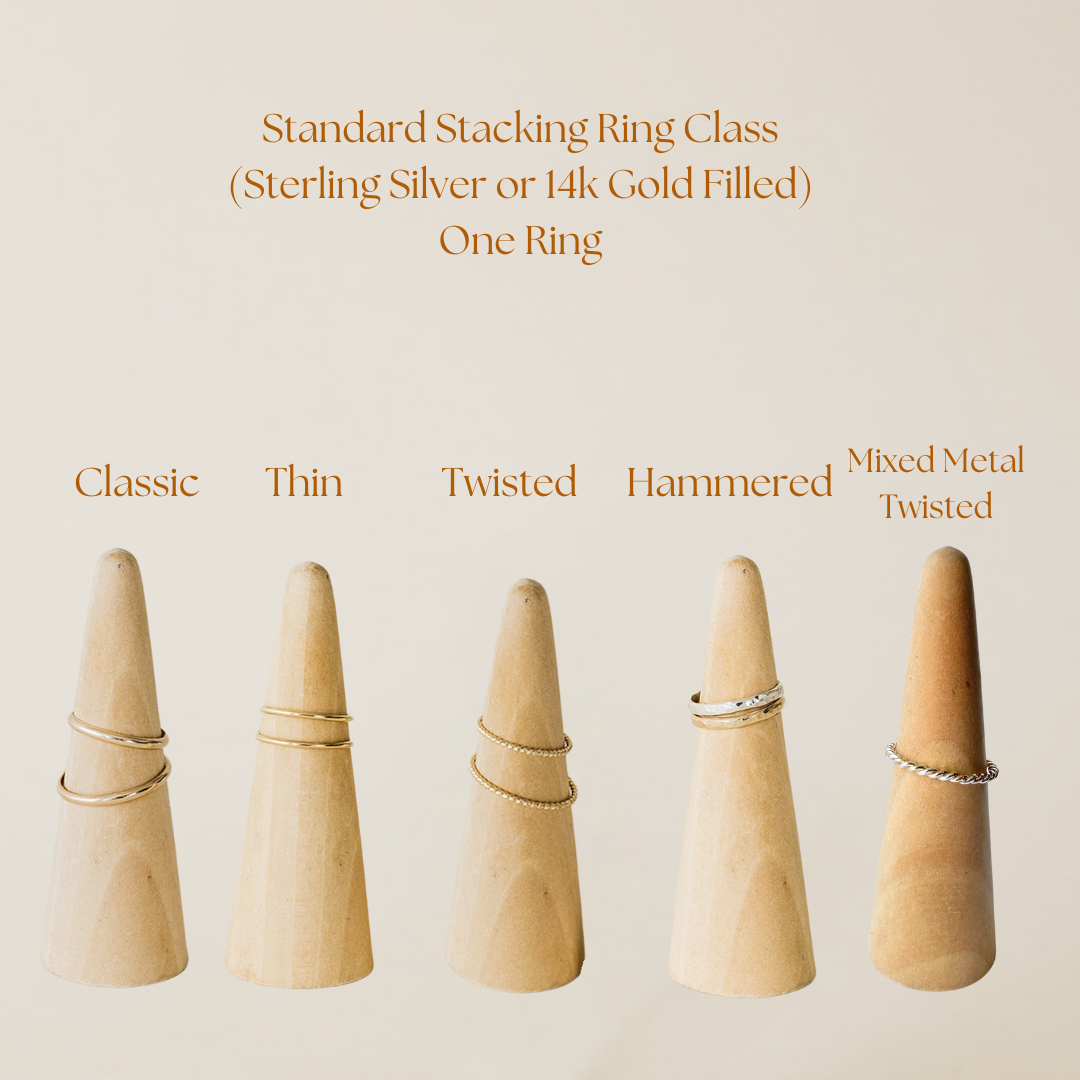Stacking Ring Workshop: ONE RING ( create in Sterling Silver, 14k Gold Filled, or 14k Solid Gold): Create a sleek, minimal ring perfect for layering. Twisted, Thin, or Hammered.